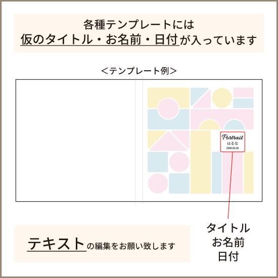 | 解像度が低いと画像が粗く印刷される場合がございます。※推奨解像度は200dpi以上です。 モニターの発色により、実際の色味と多少異なる場合があります。 ページ数によってテンプレートの配置にばらつきがございます。デザイン作成の際はご注意ください。 ファイルをアップロードできない場合は恐れ入りますが、お問合せフォーム からご連絡ください。 デザイン違いで複数個の作製をご希望のお客様は、デザインごとに「デザインキーの発行とカートへの商品追加」が必要です。商品がすべてカートに入りましたら、まとめてご注文をお願いいたします。 | お取り扱い上の注意 |