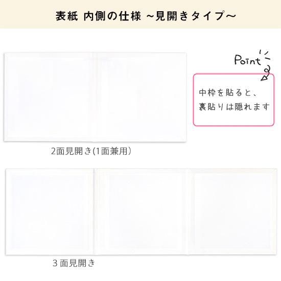 | 商品名:UV印刷台紙 BASIC デザイン写真台紙 ミドルサイズ[UV-01M] 見開きタイプ (2・3面) 約258×258(mm) ブックタイプ (4・6面) 約262×262(mm) ブックタイプ 下台白 ※2面見開きタイプは1面用としてもお使いいただけます。 4面ブックタイプは3面用、6面ブックタイプは5面用としてもお使いいただけます。 ※仕様・デザイン等を予告なく変更する場合がございます。予めご了承ください。 | 商品情報 |