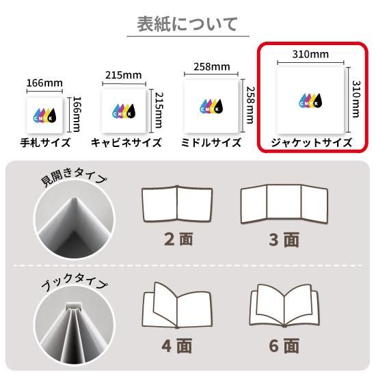 | 商品名:UV印刷台紙 BASIC デザイン写真台紙 ジャケットサイズ[UV-01J] 見開きタイプ (2・3面) 約310×310(mm) ブックタイプ (4・6面) 約318×318(mm) ブックタイプ 下台白 ※2面見開きタイプは1面用としてもお使いいただけます。 4面ブックタイプは3面用、6面ブックタイプは5面用としてもお使いいただけます。 ※仕様・デザイン等を予告なく変更する場合がございます。予めご了承ください。 | 商品情報 |