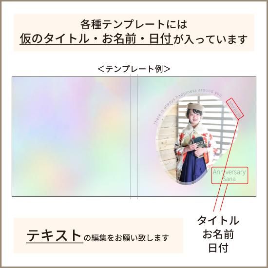 | お気に入りの1枚をパステル調のかわいい表紙にプリント。 百日祝や七五三・成人式など、多目的にご使用できます。 【印刷について】 弊社では、特色(スポットカラーやDIC、PANTONE)の使用や色の指定には対応ができません。 素材の色味に依存するため、色調の完全再現は出来かねます。ご注意ください。 | デザイン作成について |